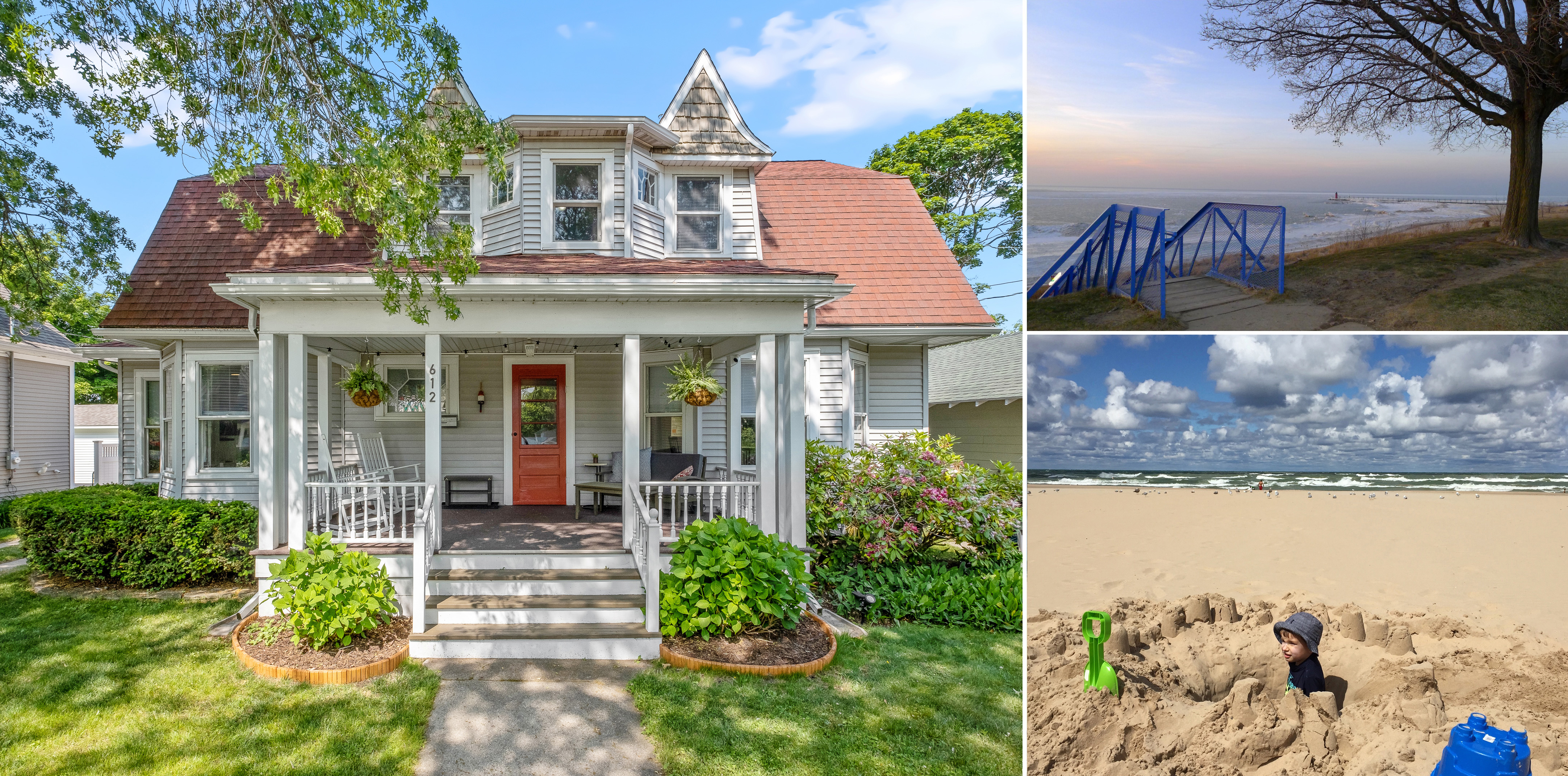 The Cape Cod-style, two-story home sits one door down from Kids’ Corner playground, one block off Lake Michigan and the Blue Stairs of South Beach, five blocks from the South Pier lighthouse, a quick walk from the picturesque downtown South Haven, and blocks from the Kal-Haven Trail for 33 miles of running and biking.