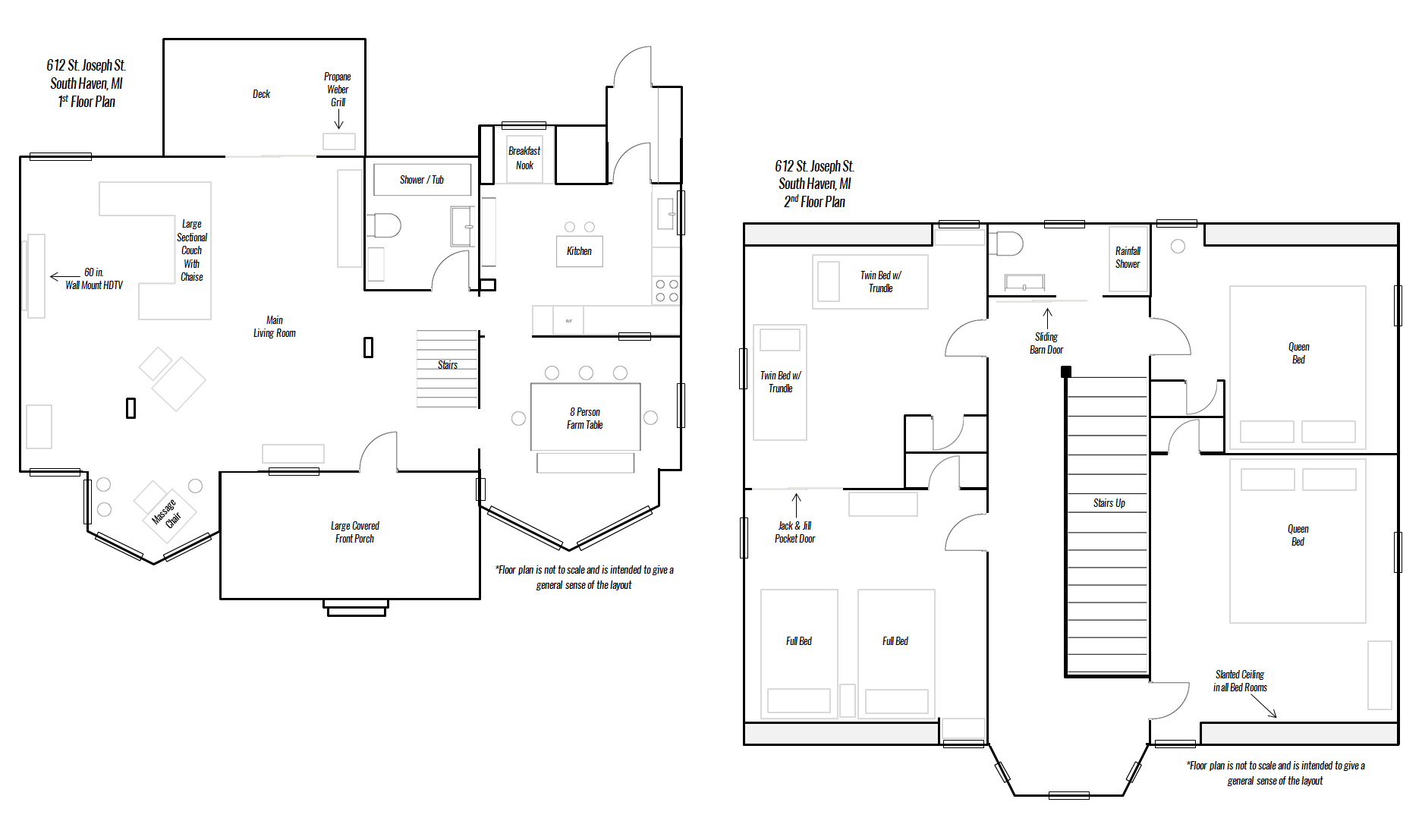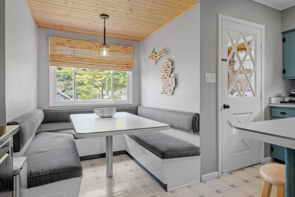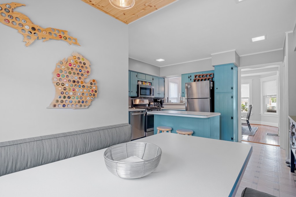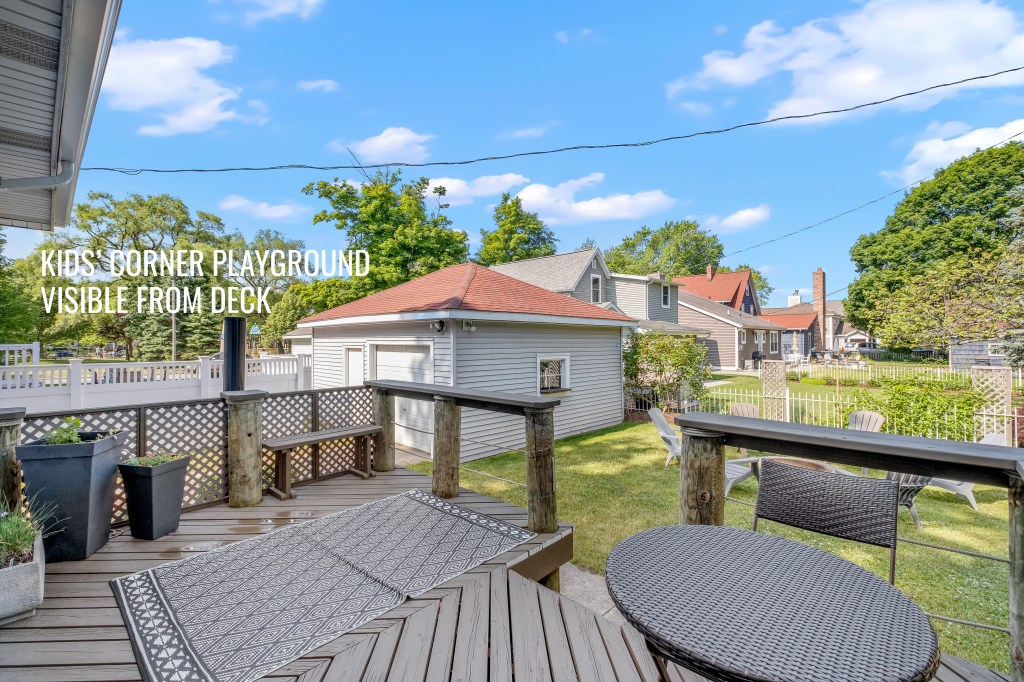Between visits to the local eateries, stay in and cook in the cheerful, cottage-y kitchen with all the dishes, pans and appliances you may need. Host dinner around the farmhouse table in the dining room or slide into the spacious kitchen breakfast nook for a game of euchre. Enjoy the soothing sounds and breezes of Lake Michigan as you grill out on the propane Weber Grill on the backyard deck, which offers a clear view of the Kids’ Corner playground. Be sure to take the one-block stroll to the lake to take in the stunning sunsets in the evenings.