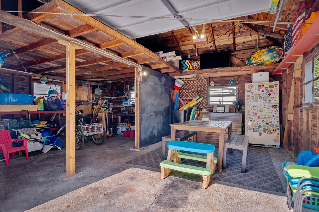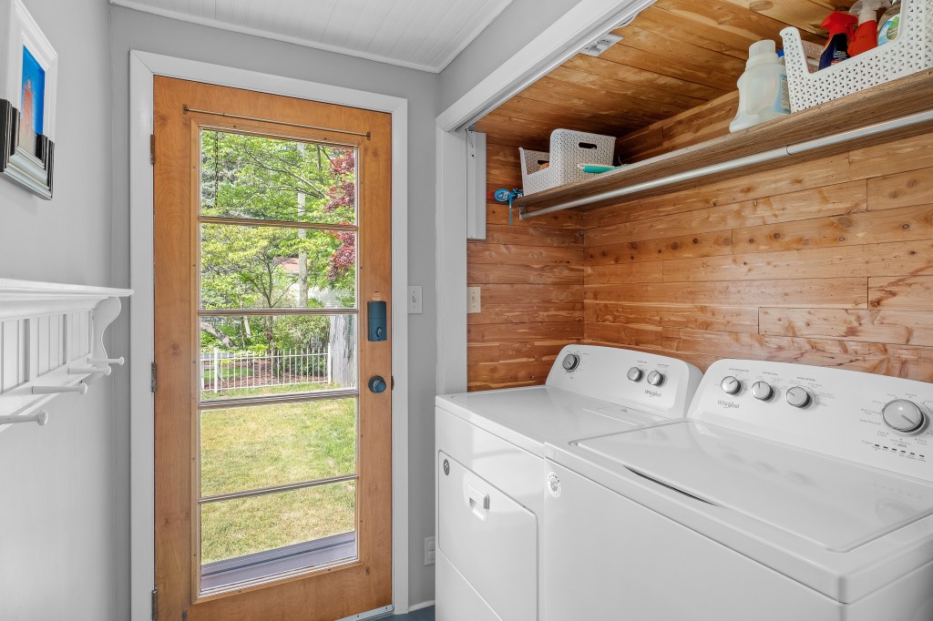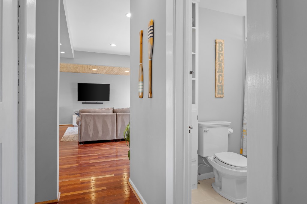 Enter the lakehouse from the covered, carpeted front porch right into the sprawling living room that’s perfect for gathering with family and friends. The room boasts comfortable furniture, cedar-paneled accent ceiling, 60-inch television and Bluetooth-friendly sound bar. The open space flows right out to the back deck, detached garage, fire pit, and yard. Hardwood floors throughout the house make it easy to sweep up any sand that might sneak in from your beach adventures.
