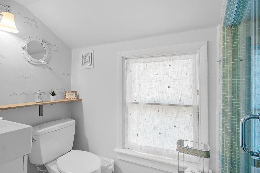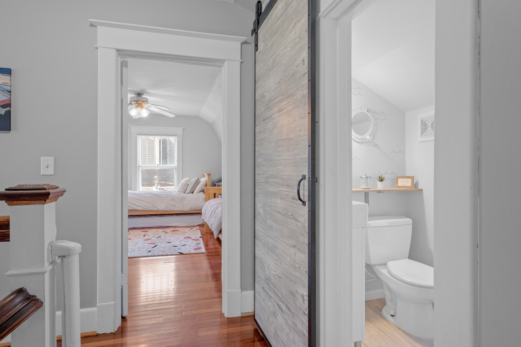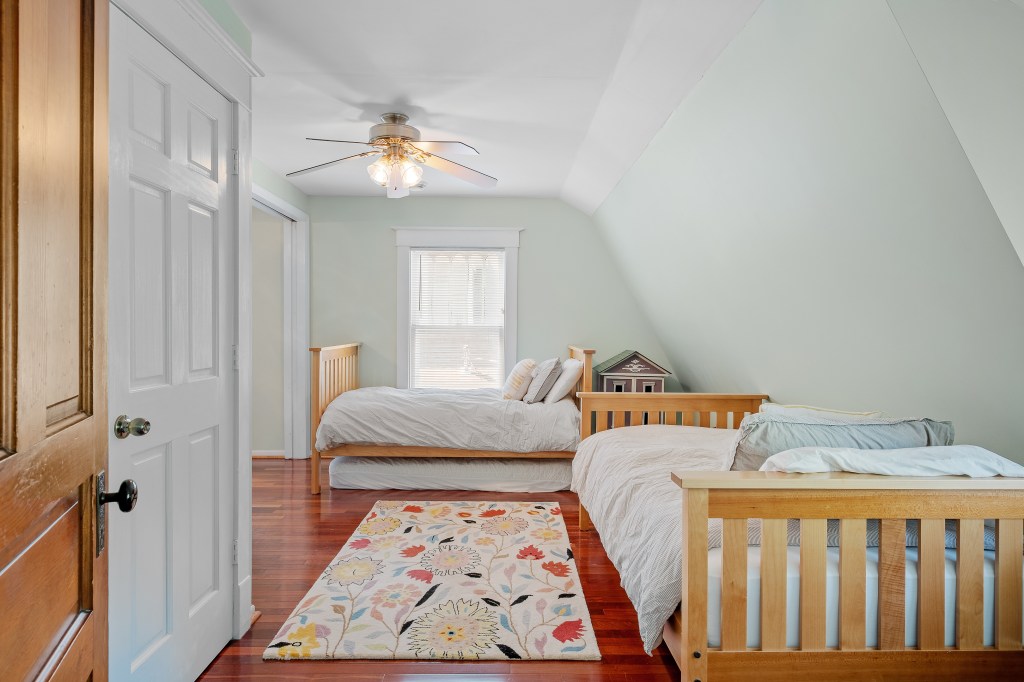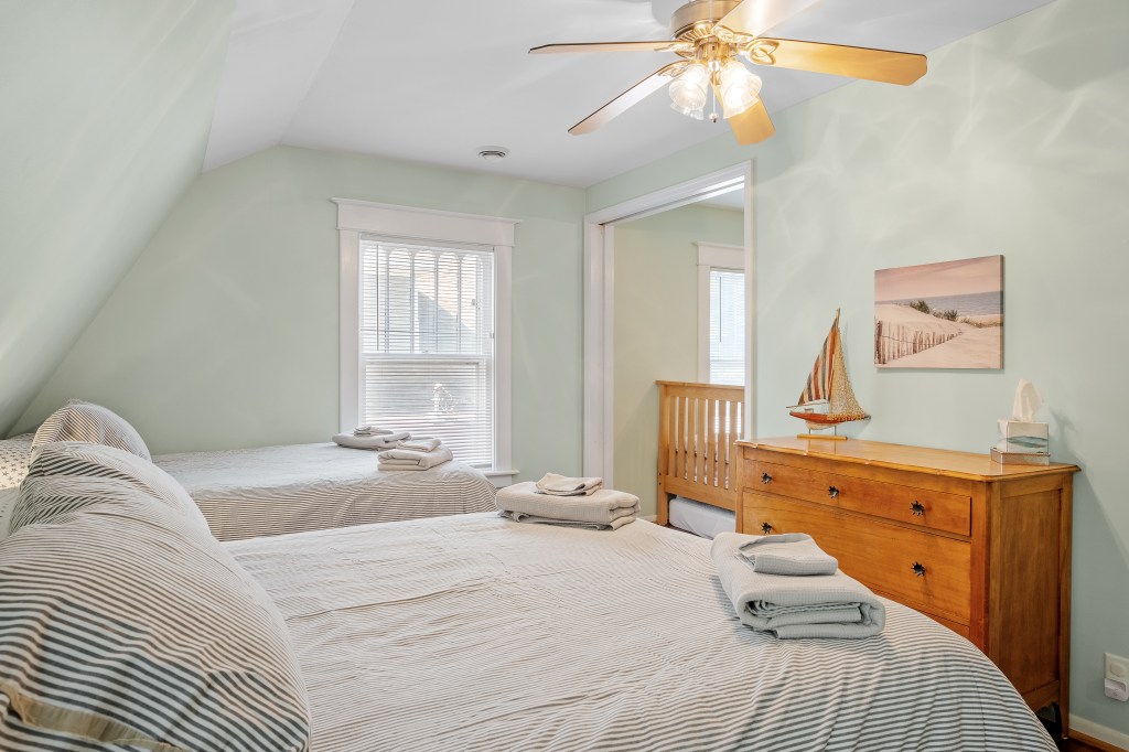 The four upstairs bedrooms, stocked with fresh linens, provide a handy mix of sleeping options: two bedrooms that each have a queen bed, one bedroom with two full beds, and one bedroom with two single beds and two pull-out trundle beds. The house has one centrally located full bathroom upstairs and one full bathroom downstairs for easy access from the backyard and gathering areas. Bathrooms include tiled showers (shower + tub on the first floor) and clean towels.